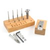 The Fretz Set #3 is a group of very small mandrels that fit into the H-2 Holder. The various mandrels make it possible to form very tight curves on bezels and other small shapes where the Bezel Stakes do not curve enough. The Micro Mushroom Stakes allow the bezels to be domed if desired. Two H-1 Holders are useful when forming a bezel with more than one stake.